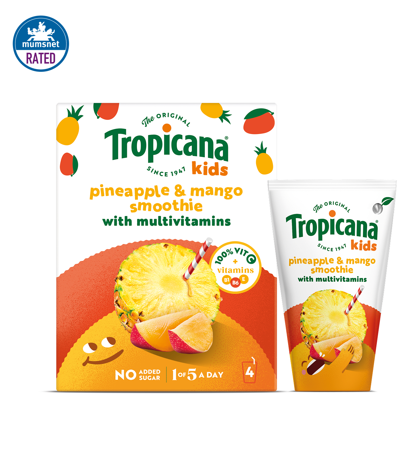 Perfect for lunchboxes or a tasty on-the-go drink, Tropicana Kids Smoothies can be enjoyed up to 12 hours out of the fridge! This tasty Pineapple & Mango Smoothie comes as a 150ml portion in handy carton with a paper straw.