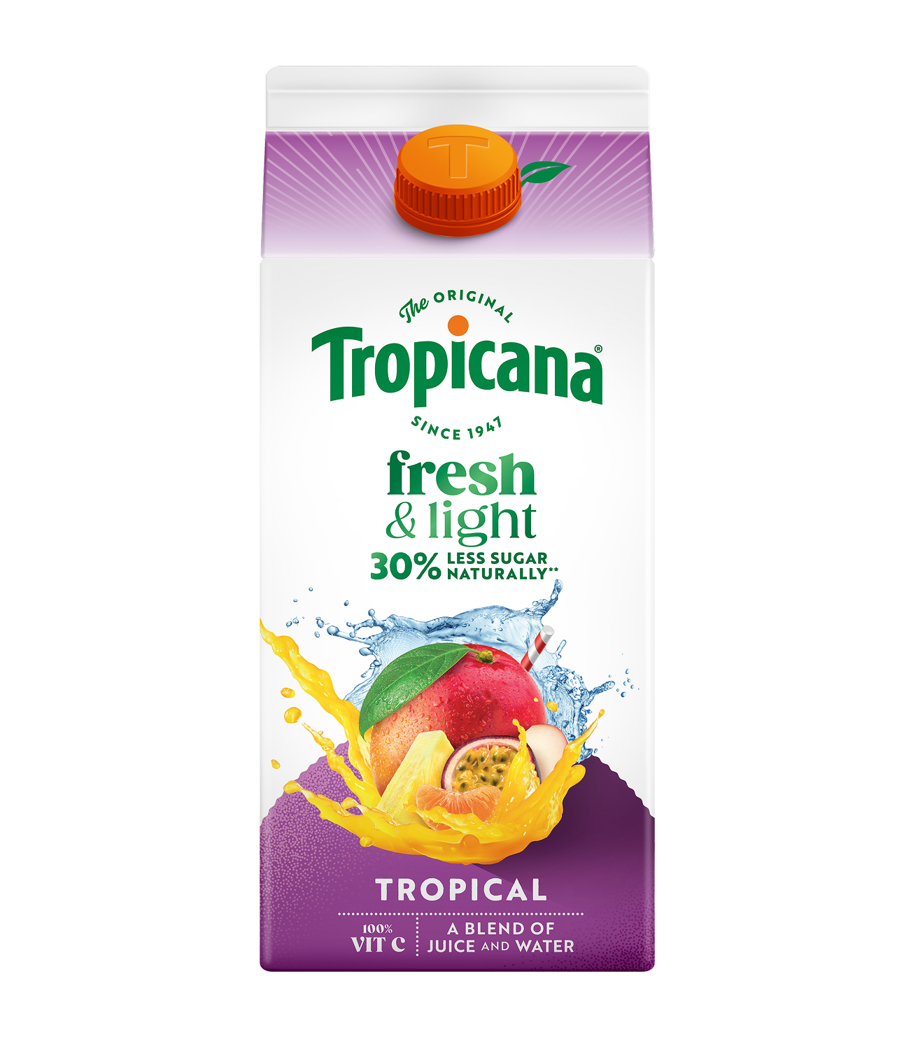 The fresh taste of Tropicana, now naturally lighter**. Tropicana Tropical in a 1.45L carton.